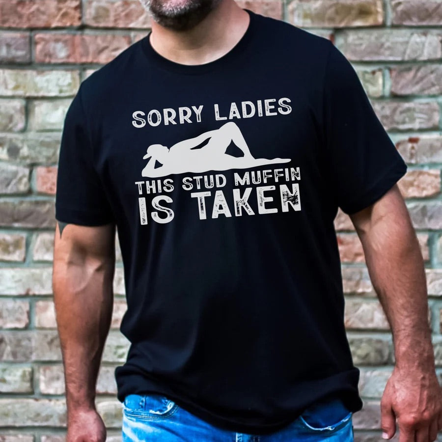 This sassy and hilarious tee is the perfect way to show the world your relationship status. The black t shirt features a white text that reads "Sorry Ladies This Stud Muffin is Taken" and is sure to draw attention and smiles. Let everyone know your taken status with this witty and humorous statement shirt.